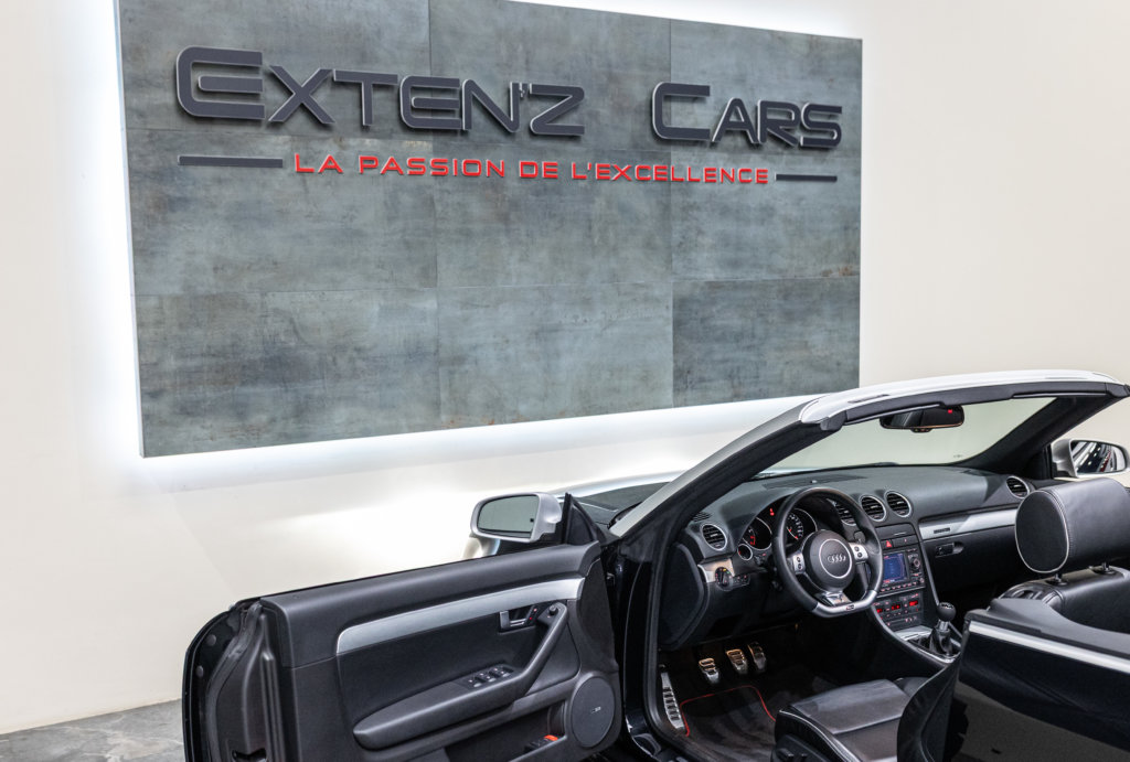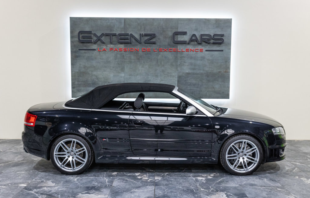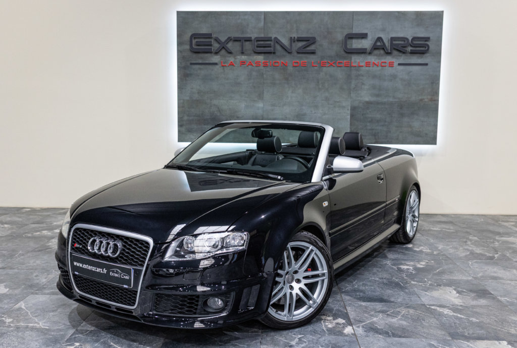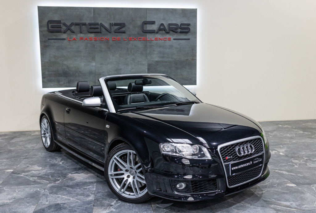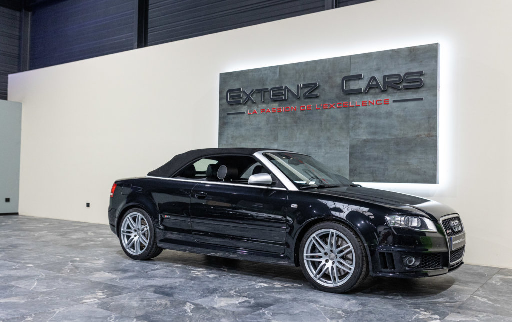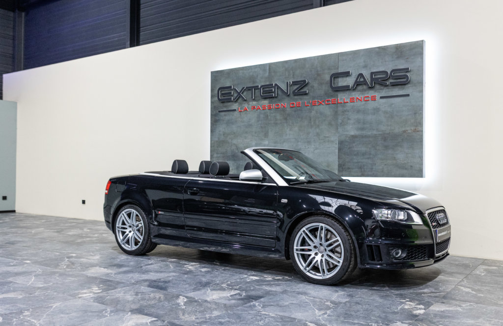 EXTEN’Z CARS vous propose une Audi RS4 Cabriolet (B7) 4.2 V8 FSI Quattro de 420 CV, mise en circulation le 22/05/2007, une véritable voiture de passion issue d’une période très particulière chez Audi Sport GmbH. Développée par quattro GmbH, cette génération repose sur une mécanique atmosphérique noble, le V8 4.2 FSI, associé à la transmission intégrale Quattro et à un châssis spécifique qui ont largement contribué à la réputation de ce modèle.