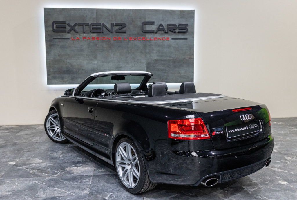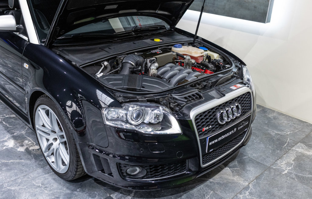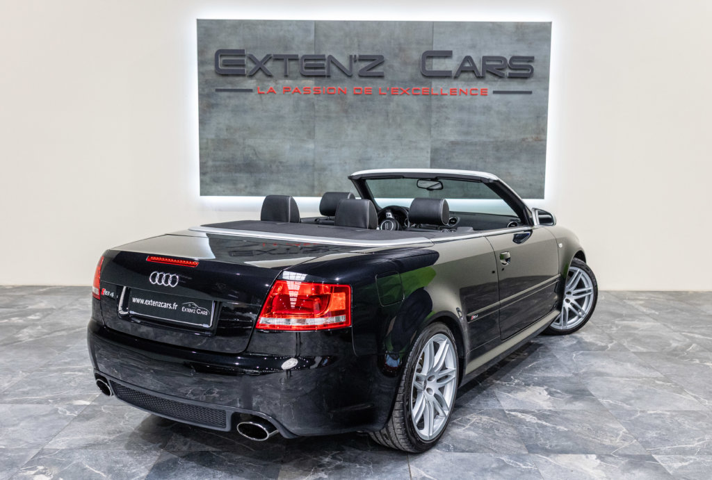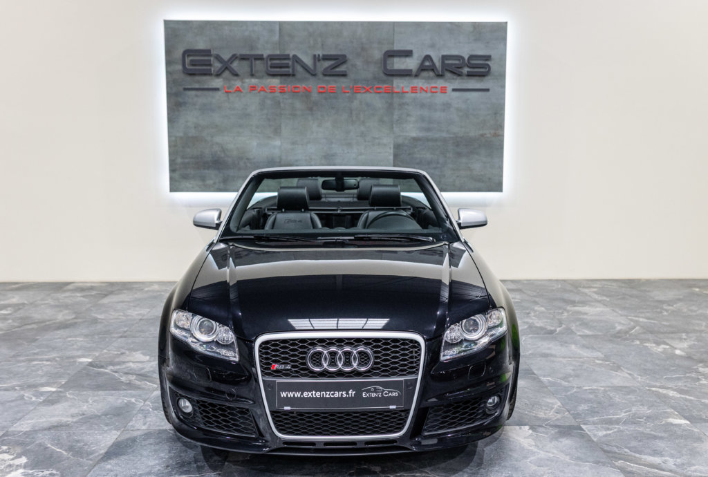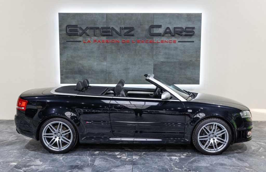 EXTEN’Z CARS vous propose une Audi RS4 Cabriolet (B7) 4.2 V8 FSI Quattro de 420 CV, mise en circulation le 22/05/2007, une véritable voiture de passion issue d’une période très particulière chez Audi Sport GmbH. Développée par quattro GmbH, cette génération repose sur une mécanique atmosphérique noble, le V8 4.2 FSI, associé à la transmission intégrale Quattro et à un châssis spécifique qui ont largement contribué à la réputation de ce modèle.
