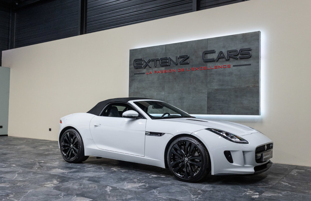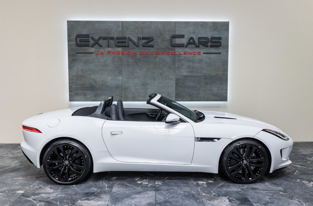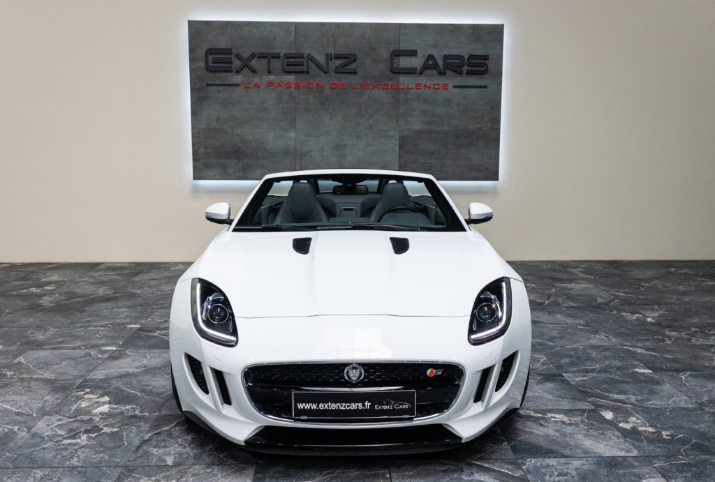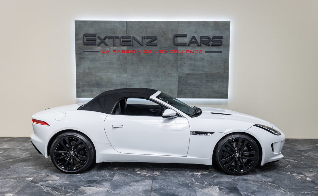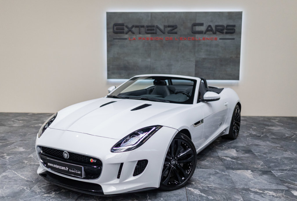 EXTEN’Z CARS vous propose cette magnifique JAGUAR F-Type Cabriolet 3.0 V6 S développant 380 CV (27cv) mise en circulation le 23/01/2014 de couleur Blanc Polaris. Séduisante à l’extérieur, la Jaguar F-Type l’est tout autant à son bord. Le style est très exclusif, mais aussi très épuré, La position de conduite est irréprochable, d’autant que les sièges offrent de multiples réglages. La Jaguar F-Type est motorisée par un V6 3,0 litres suralimenté de 380 ch. C’est la première fois qu’un V6 aura autant flatté nos tympans. Bien aidée par sa boîte automatique à 8 rapports. Structure en aluminium, liaisons au sol allégées, et mécaniques affûtées sont au programme. Poignée de maintien destinée au passager, bouton de mode Sport typé aviation, Le travail est abouti.