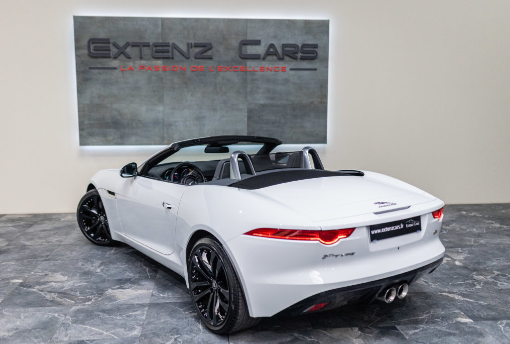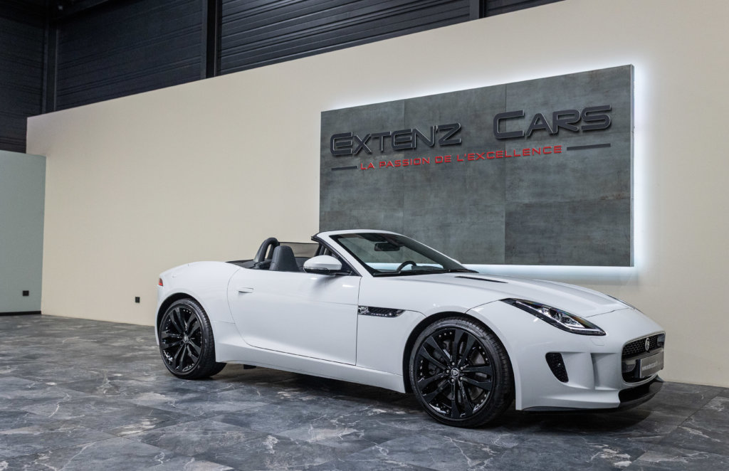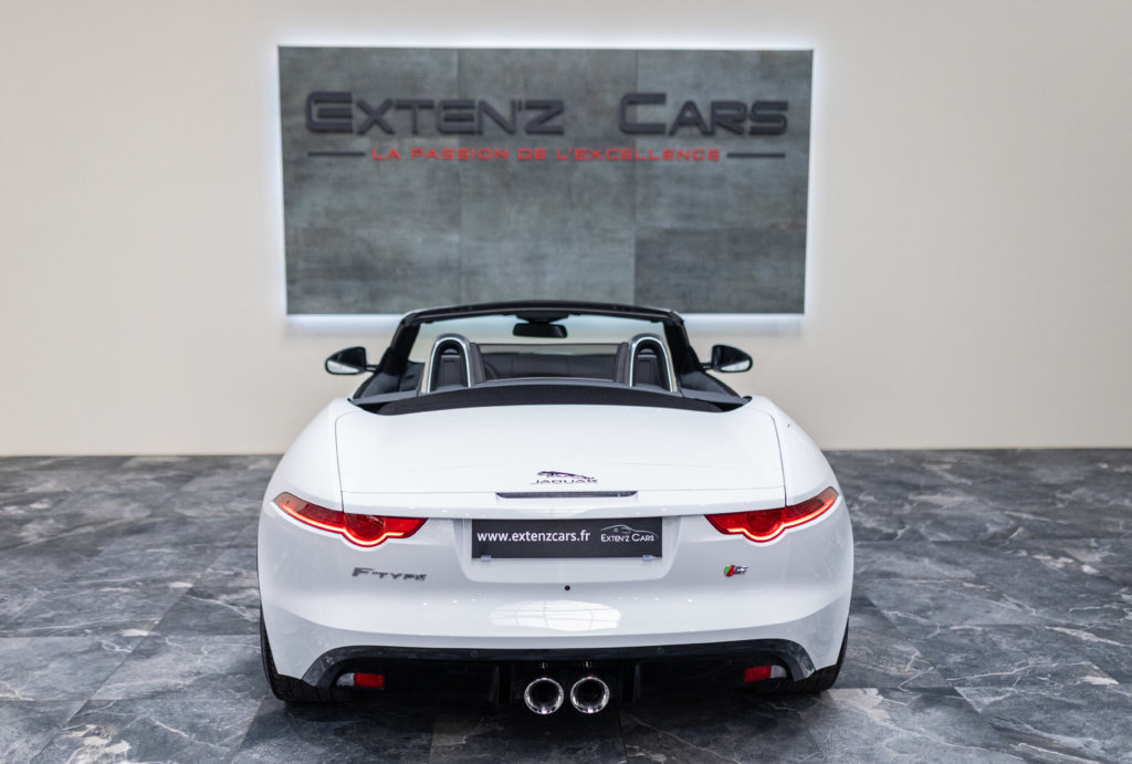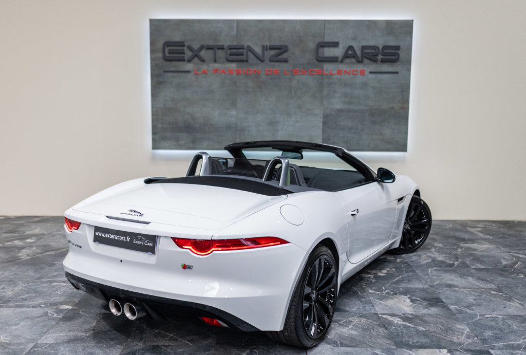 EXTEN’Z CARS vous propose cette magnifique JAGUAR F-Type Cabriolet 3.0 V6 S développant 380 CV (27cv) mise en circulation le 23/01/2014 de couleur Blanc Polaris. Séduisante à l’extérieur, la Jaguar F-Type l’est tout autant à son bord. Le style est très exclusif, mais aussi très épuré, La position de conduite est irréprochable, d’autant que les sièges offrent de multiples réglages. La Jaguar F-Type est motorisée par un V6 3,0 litres suralimenté de 380 ch. C’est la première fois qu’un V6 aura autant flatté nos tympans. Bien aidée par sa boîte automatique à 8 rapports. Structure en aluminium, liaisons au sol allégées, et mécaniques affûtées sont au programme. Poignée de maintien destinée au passager, bouton de mode Sport typé aviation, Le travail est abouti.