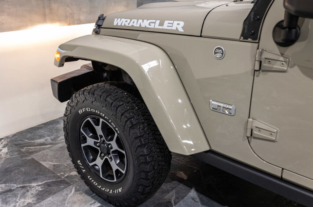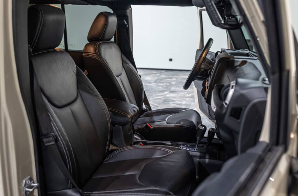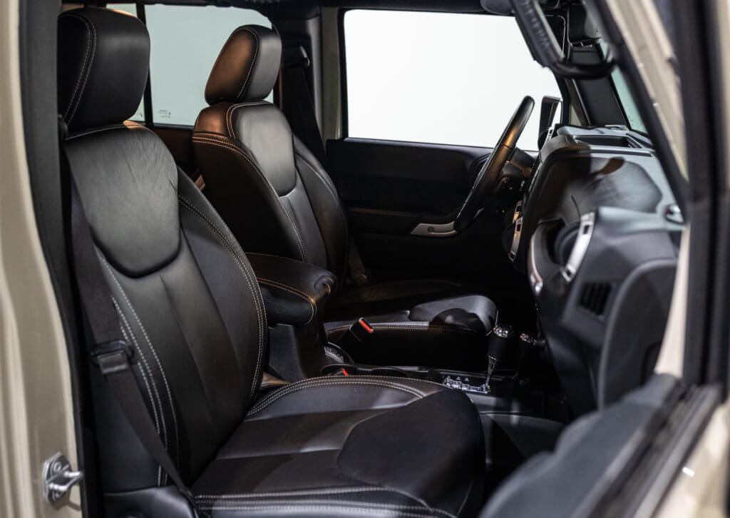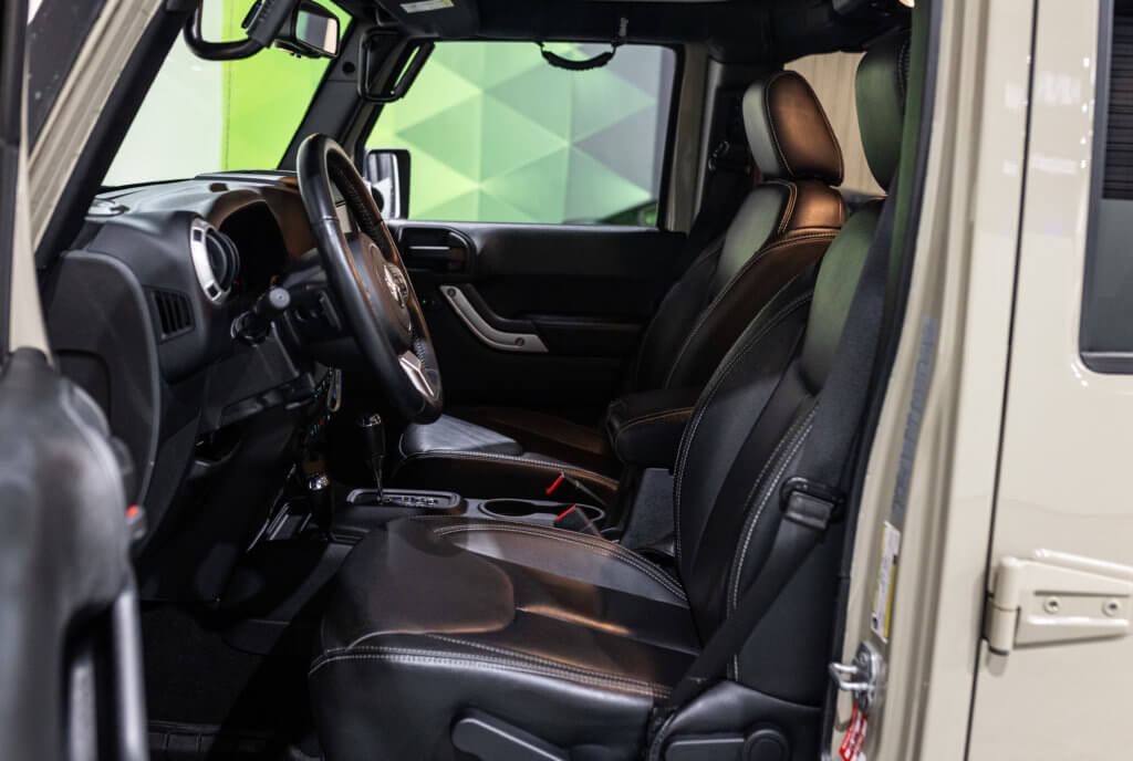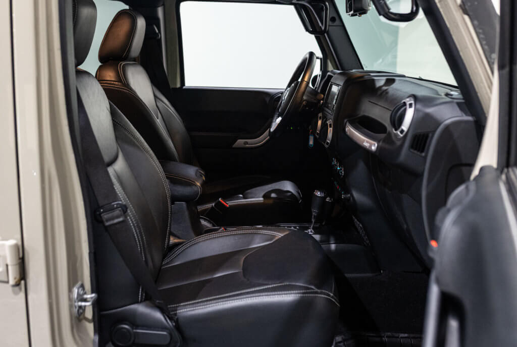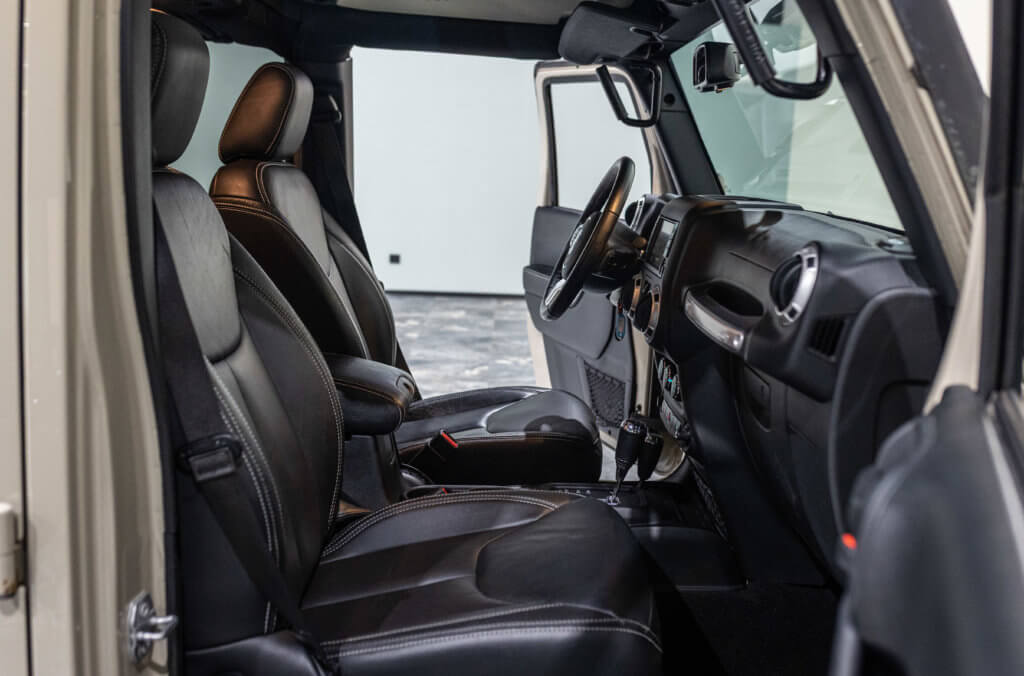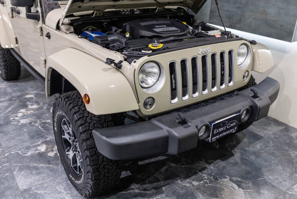 Elle est habillée de la teinte Gobi (code PUA), une superbe couleur sable beige chaud emblématique de l’univers Jeep, cet exemplaire de seconde main se présente dans un excellent état de conservation, aussi bien esthétique que mécanique.