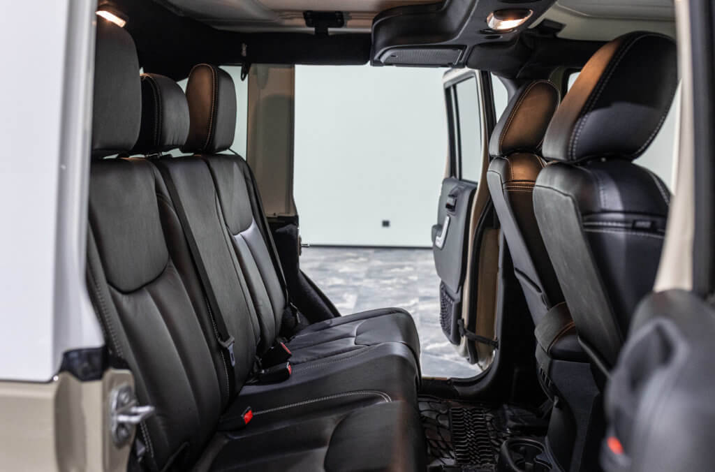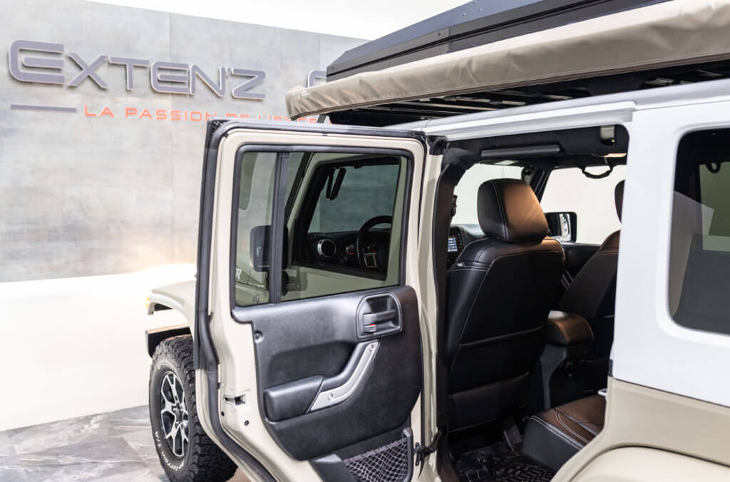 Ce Wrangler se distingue également par la présence d’une tente de toit Alu-Cab, un équipement haut de gamme reconnu dans l’univers du voyage et de l’overland. Conçue avec une coque rigide en aluminium, elle offre une excellente résistance, une parfaite étanchéité et une grande longévité, même en conditions exigeantes. Son système de déploiement rapide permet une mise en place simple et efficace, idéale pour les escapades et les voyages au long cours.