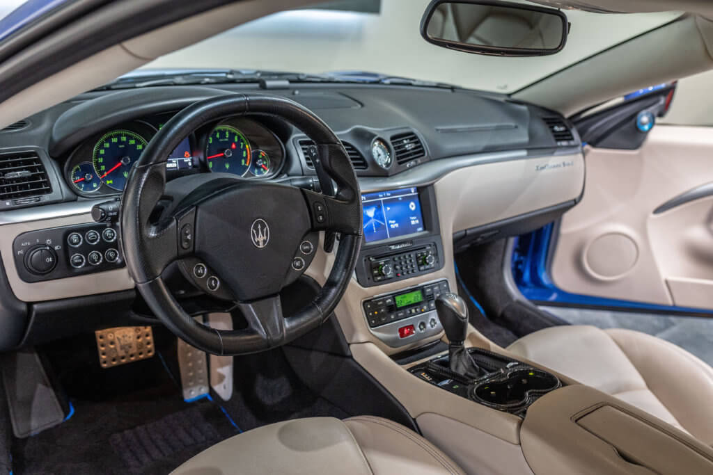 EXTEN’Z CARS vous propose cette magnifique Maserati GranTurismo Sport 4.7 V8 460CV (38cv), mise en circulation le 01/03/2017, dans une configuration rare et élégante Bleu Sofisticato Perl. Un design intemporel, une sonorité envoutante et une mécanique signée Ferrari, cette Maserati coche toutes les cases d’une vraie GT de passionné. Elle est équipée du moteur V8 atmosphérique de 460 CV, une sonorité incroyable et des performances qui font d’elle l’une des dernières vraies Grand Tourisme à émotions. Comparée à la version standard, cette version Sport se démarque par un style plus agressif, des freins majorés, une suspension optimisée et un passage de vitesses plus rapide. Elle est équipée de la boîte automatique ZF, reconnue pour sa fiabilité, sa douceur et sa rapidité, sans contrainte de remplacement d’embrayage, ce qui en fait un choix idéal pour une utilisation sereine et sans coût