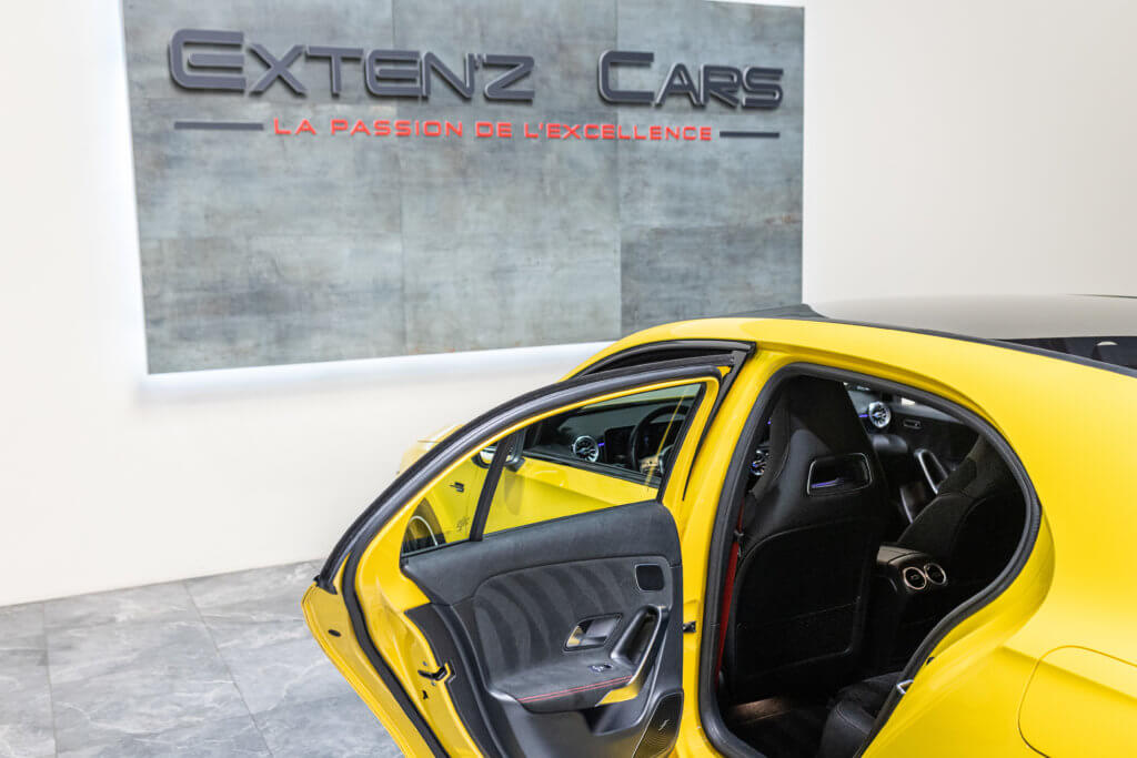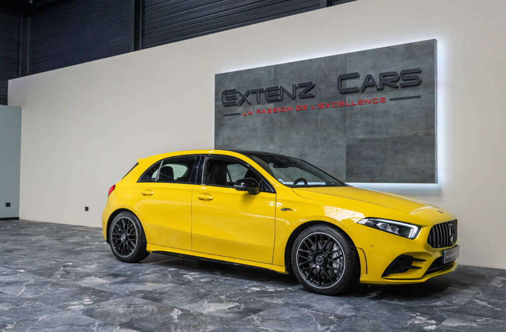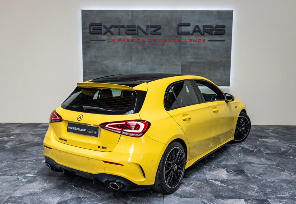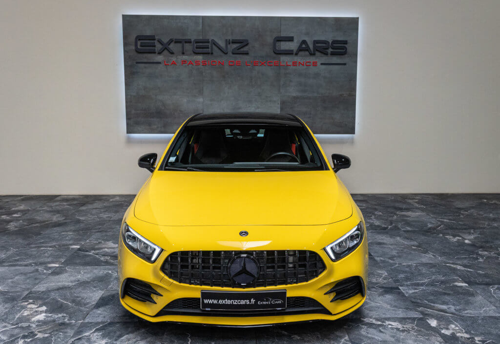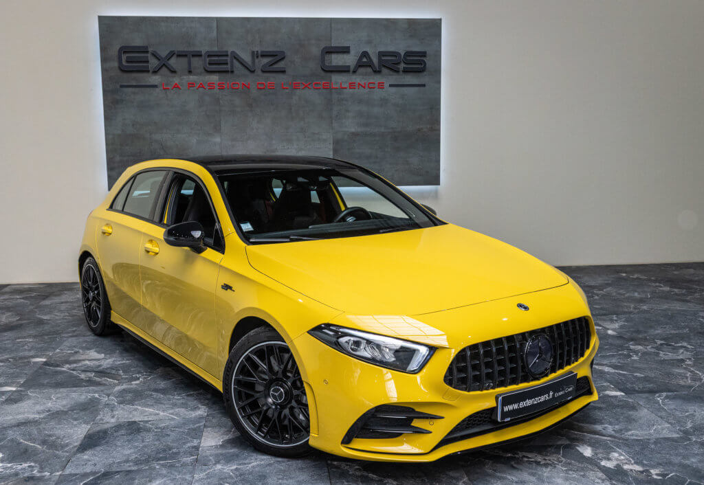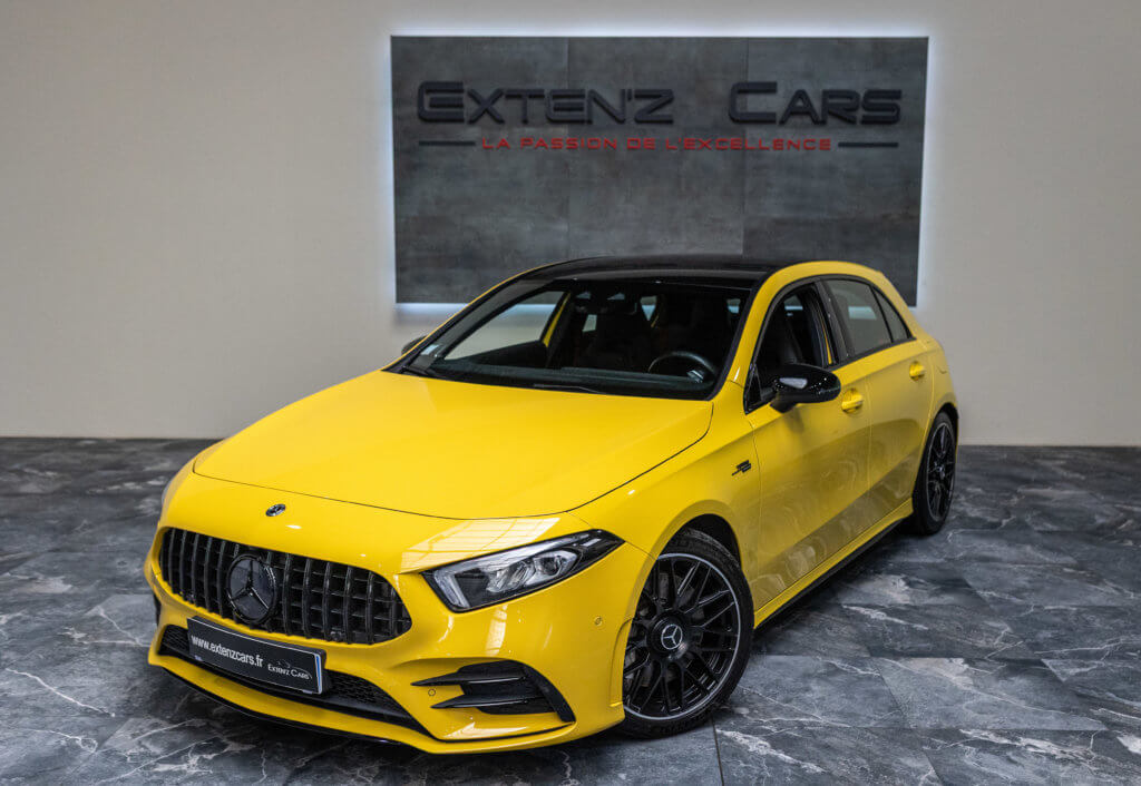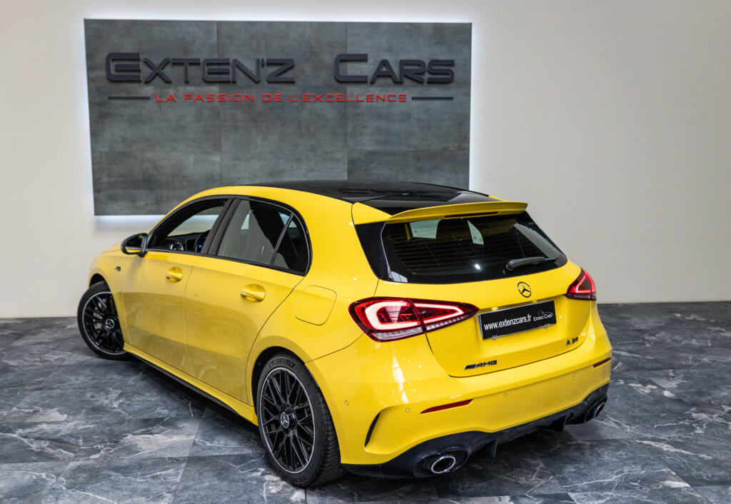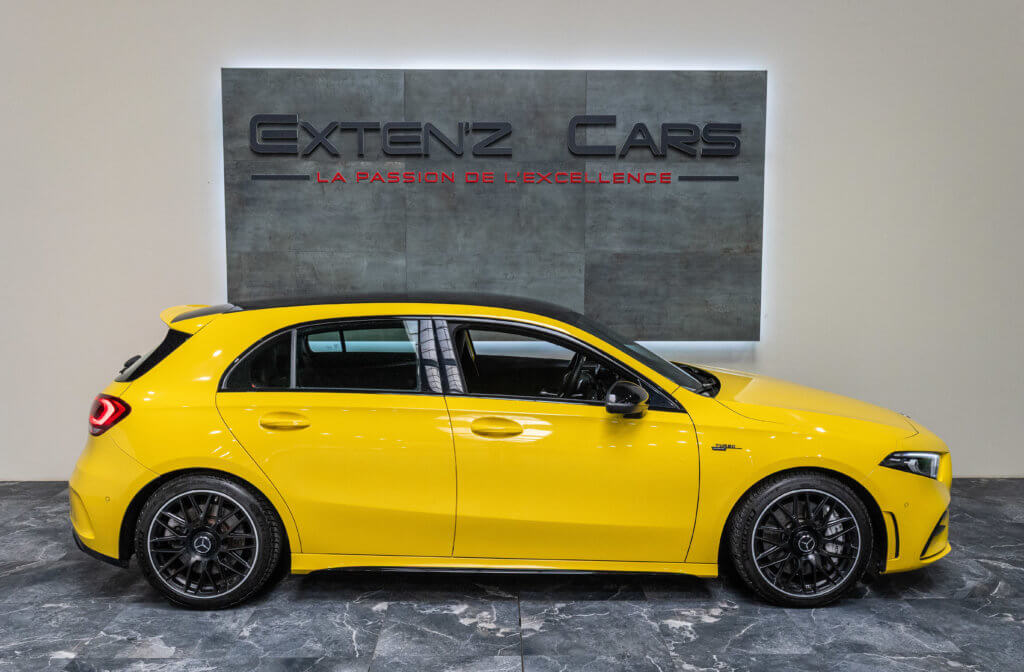 EXTENZ CARS vous propose cette Mercedes A 35 AMG 4MATIC, mise en circulation le 09/08/2019, une compacte sportive au caractère affirmé, alliant performance, technologie et design moderne. Dans cette configuration Jaune Soleil (code 914), associée à des éléments noir brillant, elle offre une présentation à la fois sportive et dynamique, avec une vraie présence sur la route. La A35 AMG incarne parfaitement le savoir-faire AMG dans un format compact, offrant un excellent compromis entre usage quotidien et plaisir de conduite. Sous le capot, le 4 cylindres 2.0 turbo développe 306 CV (20cv), avec une belle réactivité et des performances largement suffisantes pour se faire plaisir. Associé à la transmission intégrale 4MATIC et à la boîte automatique, l’ensemble reste à la fois efficace et agréable à utiliser au quotidien.